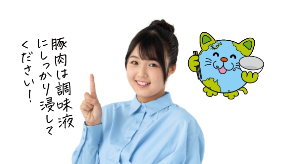 - ①豚こま切れ肉を保存袋に入れて、調味料・おろししょうがを入れて揉みこむ。