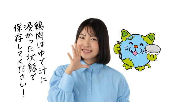 - ③冷めたら保存袋に、鶏肉(切らずにそのまま)とゆで汁を入れ、ゆで汁に浸かった状態にして冷蔵庫または冷凍庫で保存する。