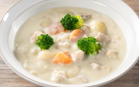 - ②耐熱皿に1を並べ、クリームシチューとブロッコリーを入れる。